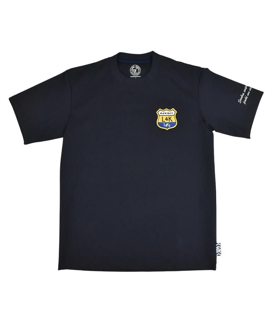 胸元には「L4K3」のロゴが入ったワッペンと袖口には刺繍をあしらったベーシックなTシャツです。